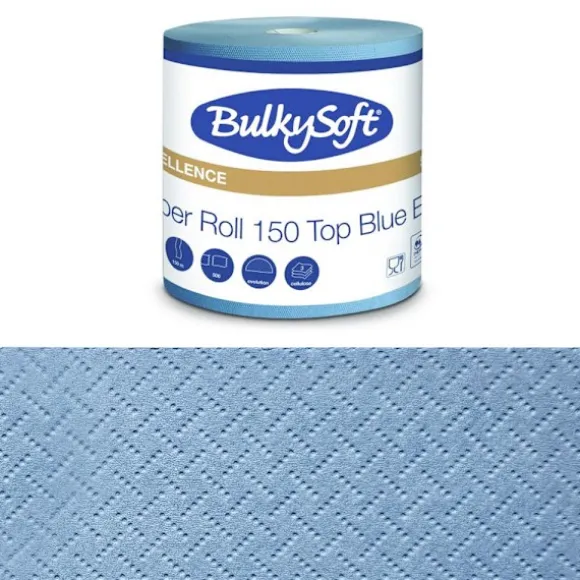 Den tjocka blå pappershandduksrullen är en exceptionellt slitstark och absorberande våtservett tillverkad av tre lager från Bulkysoft Excellence. Det är en superabsorberande våtservett, perfekt för industriellt bruk, till exempel som en multifunktionell våtservett för svåra fläckar.