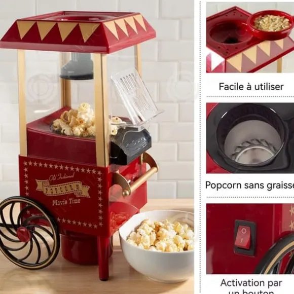 2. Retro popcornmaskin: Denna maskin startar utan förvärmning och förbereder popcorn på bara 3 minuter. Det transparenta locket värms jämnt, vilket säkerställer en jämn tillagning av popcorn.