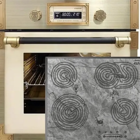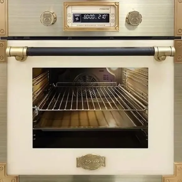 Typ av ugn: Multi 10 XXL elektrisk multifunktionsugn med pyrolys Finish: Elfenben – glas Handtag täckt med läder Art Deco, metallpartier – Antikguld –