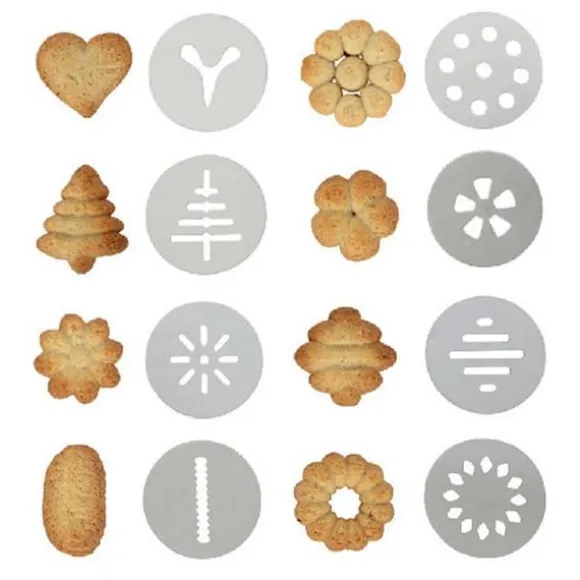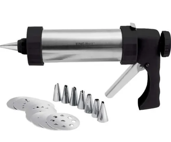 En kakmaskin är en beprövad och pålitlig enhet som kommer att påskynda produktionen av hemgjorda kakor. Solida material och noggrant utförande av sprutan garanterar många års användning. Kakmaskinen har 8 kakmönster och möjlighet att justera deras tjocklek. Tack vare en korrekt utformad kolv trycks degen helt genom kakpressens cylinder, vilket eliminerar problemet med att munstycket täpps igen. Setet innehåller även 8 munstycken för att dekorera kakor, kakor och tårtor. Maskinen kan tas isär och tvättas noggrant. – Stålkolvstång – ABS-spak – Justerbar kaktjocklek – 8 kakskivor – 8 dekorationsmunstycken – Lätt att rengöra – Trycker degen genom cylindern helt, utan att täppa igen – Lätt att hålla i och styra pressen