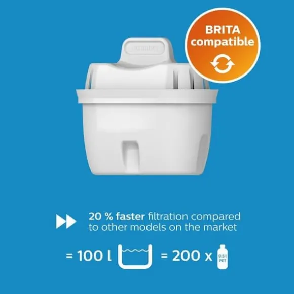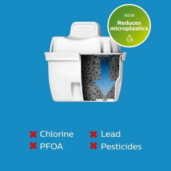 Effekten av Philips Micro X-Clean-filtret: Reducerar effektivt skadliga ämnen som mikroplaster, klor, kalkavlagringar, tungmetaller, PFOA och andra föroreningar. Den överlägsna filtreringen av denna högpresterande teknologi ger 20 % snabbare vattenfiltrering jämfört med liknande modeller och större kalkreduktion. Det förlänger också livslängden på köksmaskiner genom att förhindra kalkavlagringar och förbättra smaken på dina favoritdrycker och måltider. Detta filter är bra för miljön, varje filter håller i 30 dagar och sparar upp till 200 plastflaskor (500ml). Patronen räcker ungefär 1 månad eller 100 liter, eller 3 månader färskvatten. Färgen på modellen är vit och dess kapacitet är 2,6 liter. Philips filterkanna +6 filterpatroner ingår i paketet. Den är gjord av plast och väger 1 kilo. Den har en filterbytesindikator. Denna vattenfilterkanna är icke-elektrisk och kräver inget batteri.