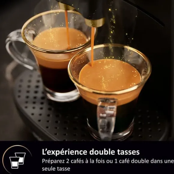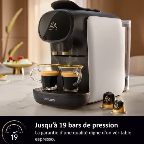 Upptäck Philips L’Or Barista Sublime kapselkaffemaskin med volymanpassning. Brygg två klassiska espresso samtidigt eller en dubbel espresso i en enda kopp, tack vare det exklusiva Double Espresso-systemet från L’Or Barista. Med sin kompakta design passar denna kaffemaskin in i alla kök. Maskinens egenskaper: – Denna kapselkaffemaskin erbjuder upp till 19 bars tryck för en perfekt espresso. – Ett stort urval av kaffe: ristretto, espresso, lungo, osv. – Justerbara kaffemängder från 25 till 270 ml. – Dubbel kapseligenkänning tack vare storleksdetektering. – Brygg 2 kaffe samtidigt eller 1 dubbel kaffe i en enda kopp med ett enkelt knapptryck. – Justerbar droppbricka för koppar av olika storlekar. – Kompatibel med L’OR Espresso, L’OR Barista eller Nespresso ®* – Varje enhet levereras med ett sortiment av 9 kapslar: 4 vanliga L’OR Espresso-kapslar och 5 dubbla L’OR Barista-kapslar.