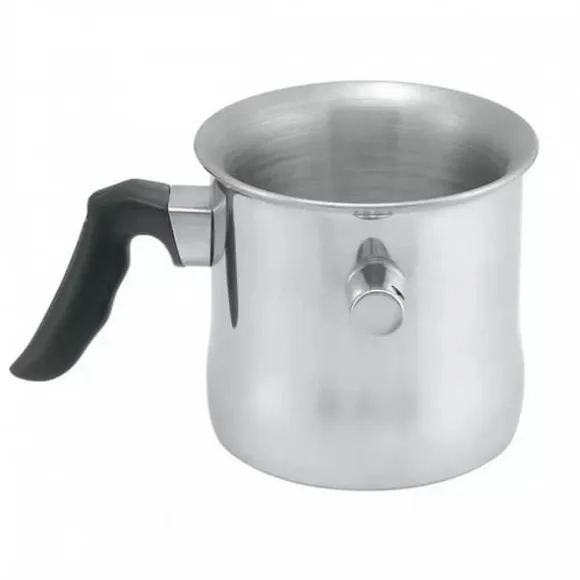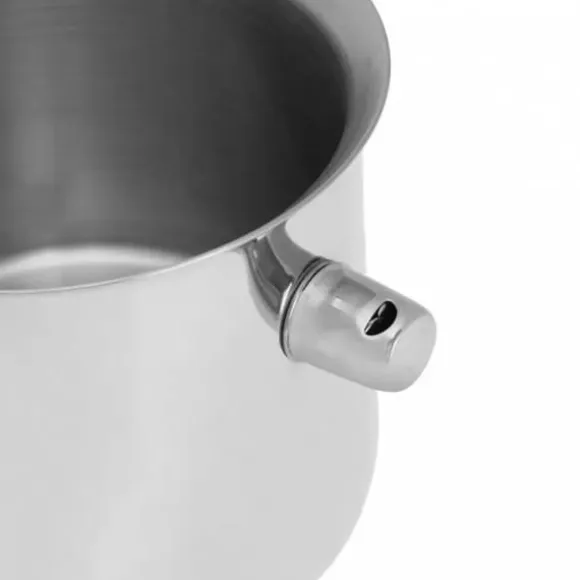 Högkvalitativt rostfritt stål Dubbelväggig yttervägg Utrustad med mätvåg: 1,5 L. Ibland räcker det med att lämna en kastrull med kokande mjölk i några sekunder. . Om du vill undvika detta problem, prova en speciell mjölkgryta med en visselpipa. Den använder två väggar med ett tomt utrymme mellan dem, som vi fyller med vatten. Detta kommer att förhindra att mjölken bränns och kokar över. Dessutom påminner en inbyggd visselpipa dig om att koka vätskan. Grytan passar alla typer av spisar, inklusive induktion.
