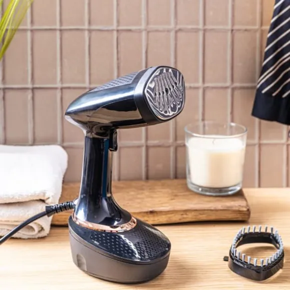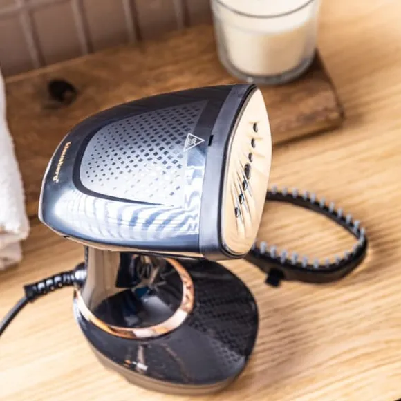 Kläd- och tygångareKLAUSBERG KB-7777I en elegant svart färg med en guldpanel ger denna moderna enhet effektiv och bekväm vård av din garderob och hemtextilier. Tack vare avancerad ångteknik eliminerar enheten inte bara rynkor utan fräschar också upp, desinficerar och återställer fräschör till även de mest krävande tygerna. Dess eleganta design och praktiska funktioner gör denna ångbåt idealisk för både hem- och resor.