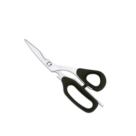 Multifunktionella kökssaxar på 21 cm i rostfritt stål med handtag av ABS-plast. Ideala för att klippa mat, ben, förpackningar och örter. Handtvätt rekommenderas för att bevara kvaliteten.