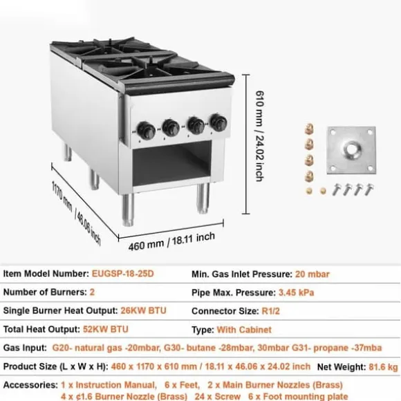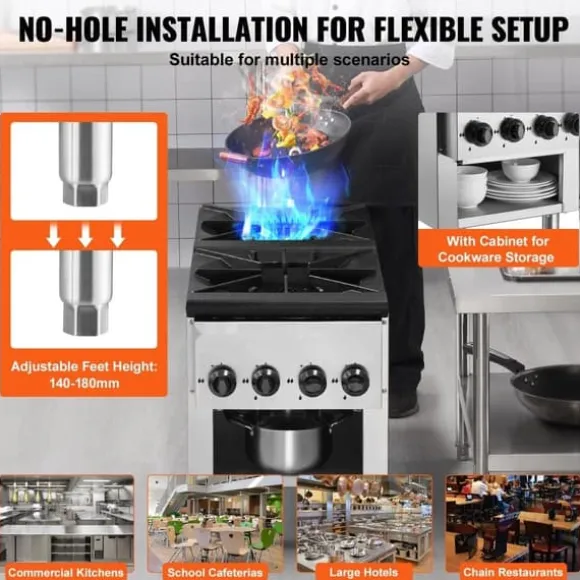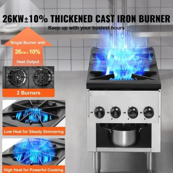 Denna kommersiella gasspis ger 52kw av kraftfull värme för snabb och effektiv matlagning. Med 2 förtjockade gjutjärnsbrännare för stabila lågor, är den perfekt för långvarig matlagning och snabb servering av måltider.