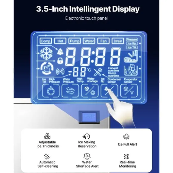 Stor isproduktion: Den kommersiella ismaskinen kan producera 550 lbs is per 24 timmar, vilket motsvarar ungefär 15 000 isbitar, och garanterar en kontinuerlig tillförsel av is i stora mängder.