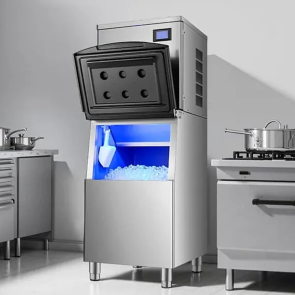 Snabb isproduktion: Den kommersiella ismaskinen är utrustad med 156 isbrickor, vilket möjliggör justering av tjockleken på isen genom att korta eller förlänga tillverkningstiden. Den kraftfulla kompressorn kan producera isbitar på endast 12-15 minuter.
