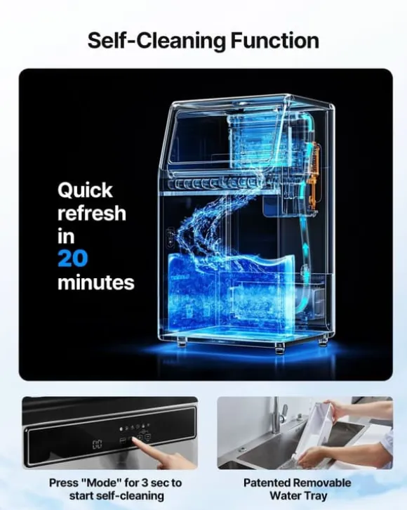 Ren is med minimal ansträngning Starta självrengöringen med en knapptryckning och få en grundlig sköljning på ca 20 minuter. Den avtagbara vattenbehållaren förenklar djup rengöring både invändigt och utvändigt.