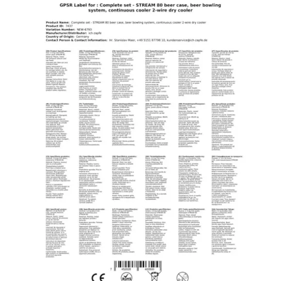 Komplett uppsättning Öltapp, Ölautomat, Ölmaskin – STREAM 80 öllåda, flödeskylare 2-linje torrkylareBestår av:•STREAM 80 ölkassett, flödeskylare 2-linjers torrkylare•anslutningar john gäst•1 x tryckreducerare 2 rader CO2 för öl Öltapp 3 bar•1 x CO2 – flaska 2,0 kg•2 x CO2 slang komplett, 1,5 m•2 x öl slang John Guest – 3/8 och 5/8 skruv-på kontaktdonet 2,00 m – helt klar•kolsyra key fångenskapÖltapp – STREAM 80 ölväska, genomströmningskylare, 2-linje torrkylare 3 minuter att packa upp… 2 minuter att ställa upp… 1 minut att ansluta = oändligt njutande.En kall, klar, nyligen tappad öl – du har förtjänat det!Ölkylaren STREAM 80 2lt är avsedd för professionell kylning och serveringav utmärkt kyld öl i hemmiljö, på trädgårdsfesteroch för medelstora kommersiella användningar.•Reglerområde+2 till +10 grader•Prestanda:90 liter/h vid 10°C TD•Kylteknologiär 45% mer effektiv•Klar att användapå endast 5-10 minuterNär termostaten ställs på Max,kommer termoblocket (efter ca 10 minuter) att ackumulera en hög mängdenergi, vilket möjliggör serveringav flera kylda öl i följd.Kylteknologin för STREAM 80 Öltapp är cirka 45% mer effektiv än den elektriska energiförbrukningen.Ölet kyls ner till kranen.Kylöglorna är tillverkade av rostfritt stål och är därför stabila och hållbara.De använda materialen uppfyller de högsta hygienstandarderna och möjliggör en lång livslängd för kylaren. STREAM 80 2lt – och den kalla ölen strömmar från 2 kranarMed sin starka kylprestanda och perfekta dimensioner tillhör ölkylaren STREAM 80 de ledande 2-linjiga bords-/underbordskylarna på marknaden.Kylprestanda från 170 till 180 glas (0,5 liter) utmärkt kyld öl per timme,Den kraftfulla kompressorn STREAM 80 säkerställer en minimal energiförbrukning och en utmärkt kyld öl utan att skummaGenomströmningskylare STREAM 80 2ltg. – Effektivitet, Prestanda, NjutningTermoblocket för ölkylaren STREAM 80 har hög energikapacitet, vilket gör att en perfekt kyld öl kan serveras redan efter 5-10 minuter.När termostaten ställs på Max, kommer termoblocket (efter ca 10 minuter) att ackumulera en hög mängd energi, vilket möjliggör servering av flera kylda öl i följd.Kylteknologin för STREAM 80 Öltapp är cirka 45% mer effektiv än den elektriska energiförbrukningen.Ölet kyls ner till kranen.Kylöglorna är tillverkade av rostfritt stål och är därför stabila och hållbara.De använda materialen uppfyller de högsta hygienstandarderna och möjliggör en lång livslängd för kylaren.Genomströmningskylare STREAM 80 – Tekniska SpecifikationerDen eleganta STREAM 80 Torrkylaren med en vikt på endast 45 kg är utrustad med en 7 mm ledning.•Mått:(BxDxH) 255х635х510 mm (inklusive droppbricka)•Strömspänning:220V, 50 Hz, 764W, 4,3A•Kompressor:3/8 PS•Linjer:2 x ölsorter•Hölje:Metall, pulverlackerad, rostsäkerHög kvalitet på utförandet och förpackningen STREAM 80 – Bäst i klassen för 2-linjiga zapfanläggningarÖlkylaren STREAM 80 är i kategorin Öltapp upp till 90 l/h, en av de bästa när det gäller förhållandet mellan kostnad,prestanda och kvalitet.Enkel rengöring av STREAM 80Med följande rengöringsset kan du enkelt och bekvämt rengöra ölkylaren STREAM 80 efter användning:Rengöringsset litetLättrengöringsset(rekommenderas)Städningsset stortÖltapp STREAM 80 – Bierkoffer, Genomströmningskylare med 2 linjer, Torrkylare, upp till 60 liter/hDet är bara att tappa några öl:Packa upp zapfanläggningenAnslut tryckregulatorn till CO2-flaskan med kolsyre-nyckeln och dra åtAnslut CO2-slangen från tryckregulatorn till tapphuvudetAnslut ölslangen till tapphuvudet och sätt in och fixera i zapfanläggningenTappa fatetJustera tapptrycket på tryckregulatornAnslut zapfanläggningen till eluttagetJustera trycket och njut av en kall öl