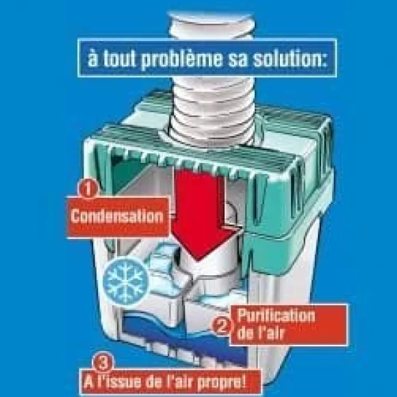 Kondensatorn för torktumlaren avfuktar luften när luftutsläppet från torktumlaren inte är möjligt genom ett hål i väggen eller ett fönster. Den flexibla slangen fästs enkelt vid torktumlaren, så att vattenånga leds genom slangen till behållaren, där den omvandlas tillbaka till vatten. Den stora volymen (8 liter) gör att den kan rymma en stor mängd fukt från luften.