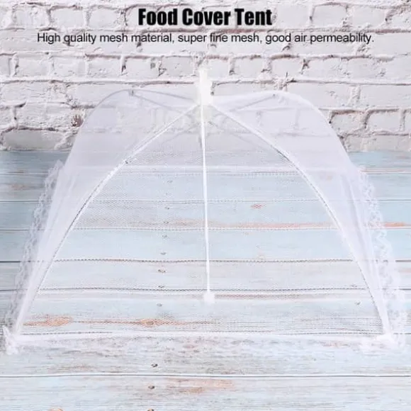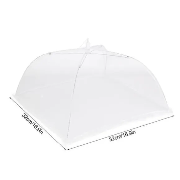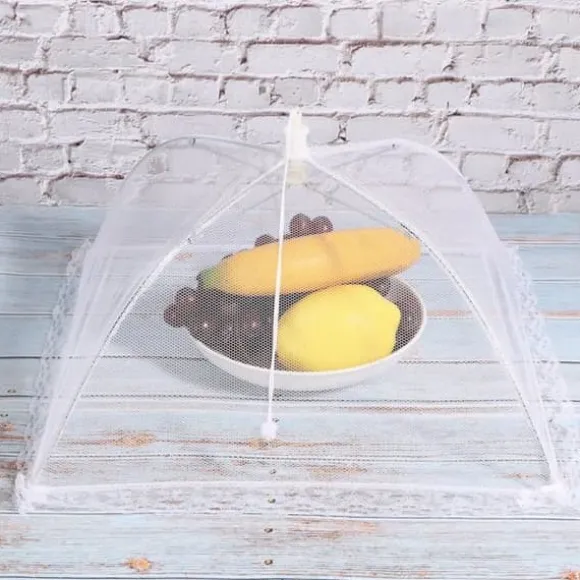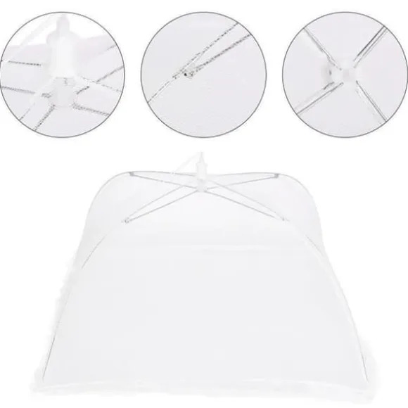 Denna vikbara mattäcke i vit nät skyddar dina livsmedel från flugor. Perfekt för grillfester, picknickar och fester, den täcker hamburgare, kött, frukter och grönsaker. Lätt att använda, den ger en dekorativ touch till ditt bord samtidigt som den håller dina rätter färska och rena.