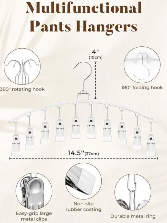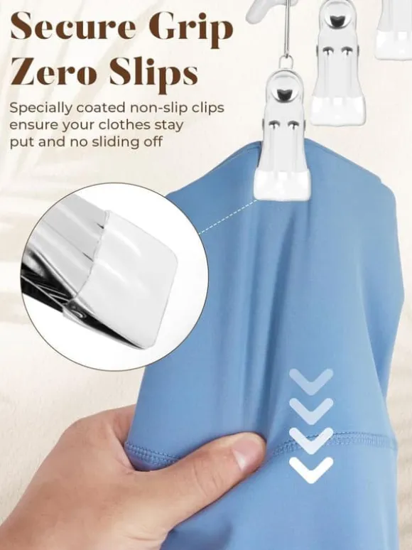 Varje hängare har 15 klämmor och passar för kjolar, klänningar, shorts, byxor och till och med barnkläder – den ultimata lösningen för effektiv garderobsorganisation.