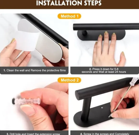 Observera: Längden på pappersrullehållaren är: 31 cm, lämplig för alla pappersrullar i standardstorlek. Om du använder den icke-borrade självhäftande fastsättningsmetoden, torka ytan före installation och vänta 24 timmar efter installationen för att säkerställa att tejpen är ordentligt fäst.