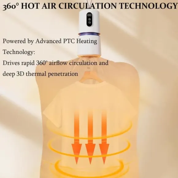 Denna produkt använder avancerat PTC-värmeelement i kombination med ett 360-graders varmluftscirkulationssystem. Värmen tränger jämnt in i tygets fibrer och torkar snabbt tunna plagg och underkläder samtidigt som fukten effektivt avlägsnas. Håller kläderna mjuka och bekväma.