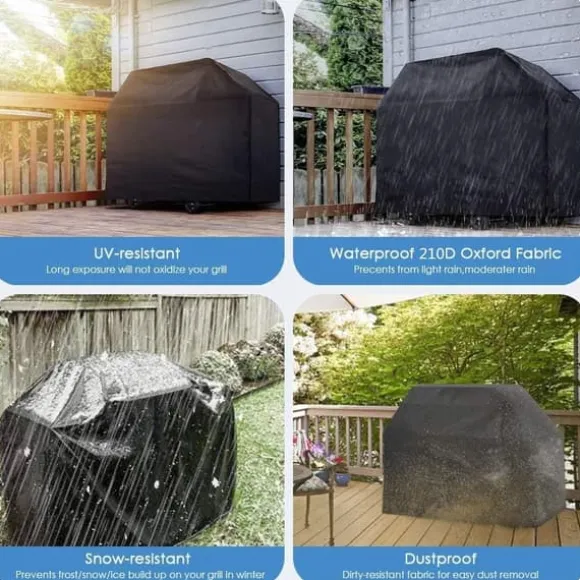 Med sin 210D Oxford-konstruktion skyddar detta grillskydd mot regn, snö och skadliga UV-strålar, vilket förhindrar rost och blekning. Det håller din grill säker och välbevarad, oavsett om den används inomhus eller utomhus.
