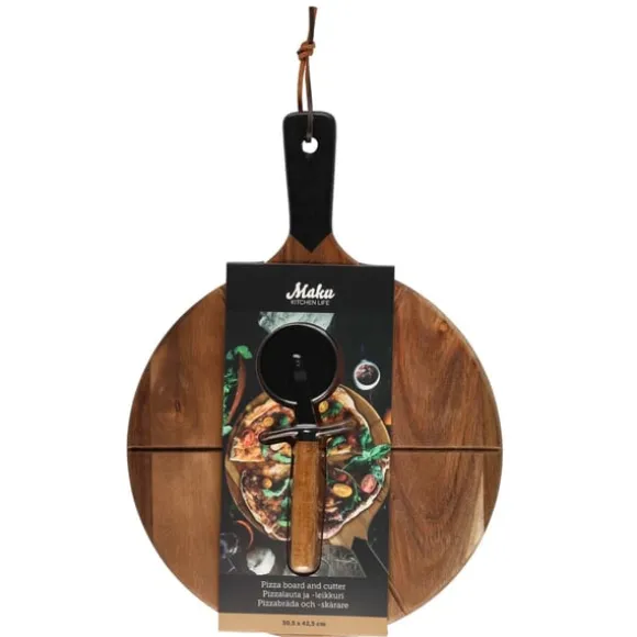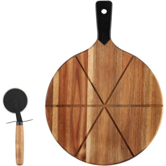 Setet innehåller en vacker pizzabricka i acaciaträ samt en praktisk pizzaslicer med non stick-belagt blad för smidig skärning.