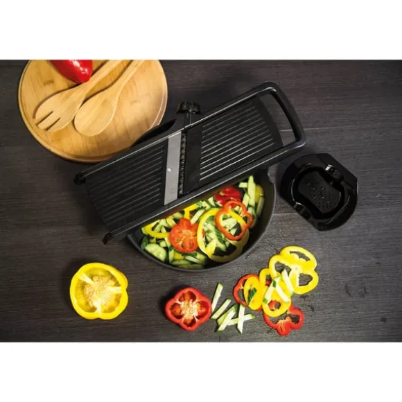 Den här mandolinskivaren är utformad för att göra matlagningen snabb och enkel. Den har ett integrerat blad tillsammans med två stående blad, vilket ger mångsidiga skivningsalternativ. Skivan kan justeras för att uppnå önskad tjocklek, vilket ger precision för olika recept. Säkerheten är prioriterad med ett fingerskydd som garanterar en säker skivningsupplevelse. Mandolinen tål dessutom maskindisk, vilket gör rengöringen bekväm och problemfri. Detta verktyg är ett utmärkt tillskott till alla kök och ger både funktionalitet och användarvänlighet.
