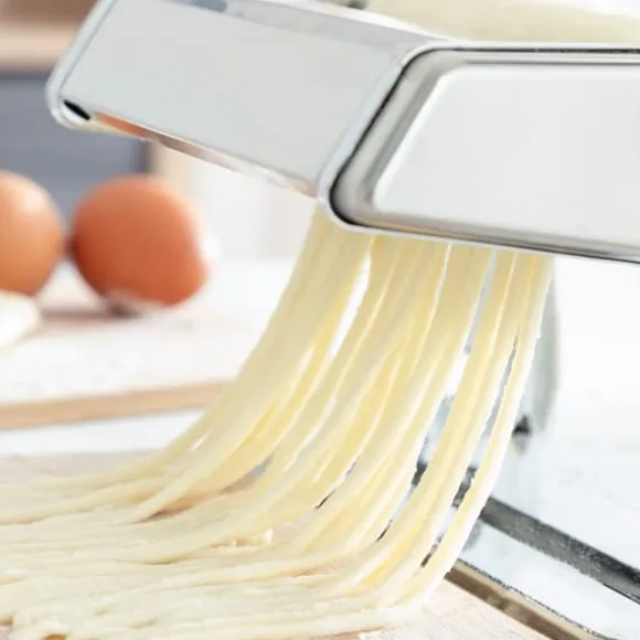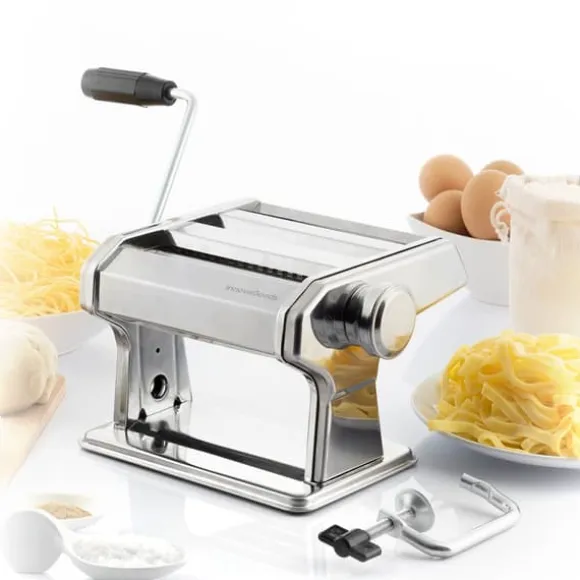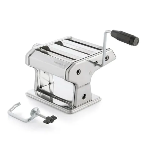 En maskin för att göra färsk hemlagad pasta och njuta av familjemiddagar bestående av ett brett utbud av läckra pastarätter. Den drivs manuellt och är multifunktionell, knådar, sträcker och skär pasta enkelt. Den har en avtagbar vev som är mycket enkel att montera och demontera, vilket gör den lätt att förvara. Detta mångsidiga kökstillbehör har 3 skärvalsar för att få 3 olika typer av pasta (spagetti, tagliatelle och lasagne). Pastatjockleken kan också justeras (8 varianter). Fixeringsklämman och de halkfria fötterna gör att maskinen kan fästas ordentligt på bordet eller bänkskivan. Den innehåller en receptmanual, den är robust och mycket lätt att använda. Det kan enkelt rengöras med en fuktig trasa.