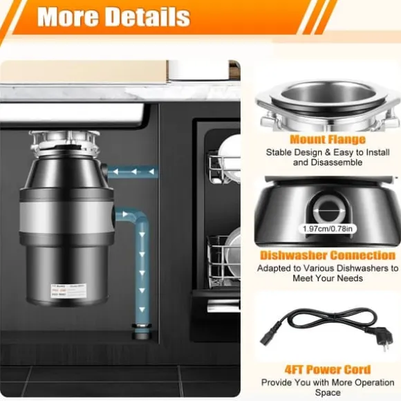 Den integrerade diskmaskinsanslutningen (Ø 0,78”) underlättar koppling till de flesta diskmaskiner. Den förlängda nätsladden (4 ft) ger mer räckvidd under installationen.