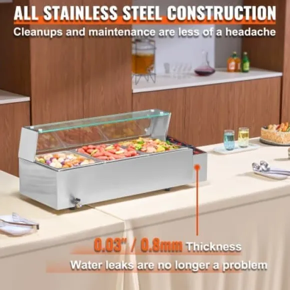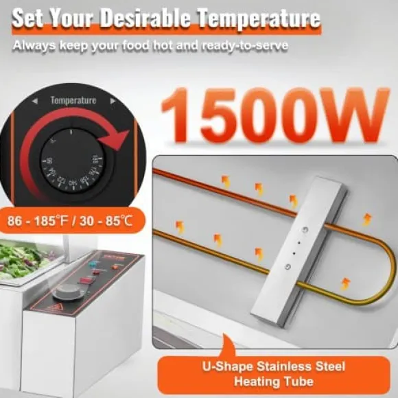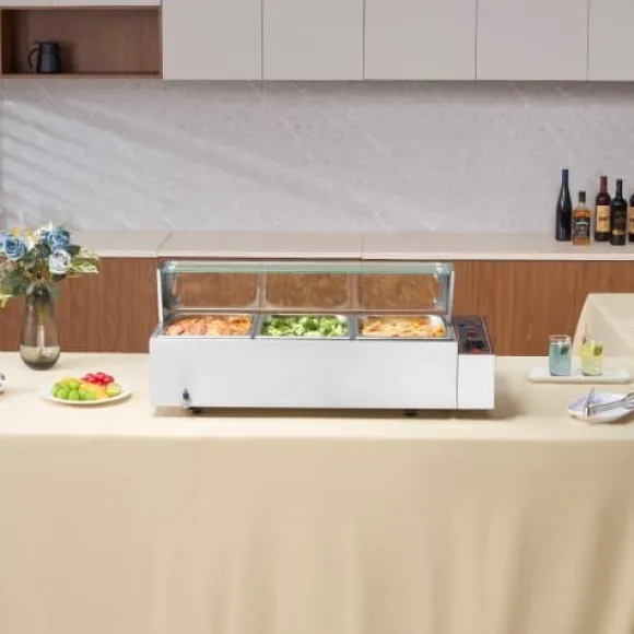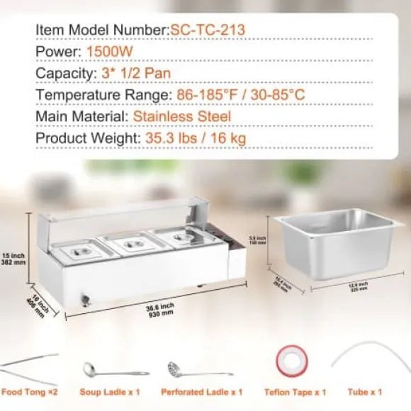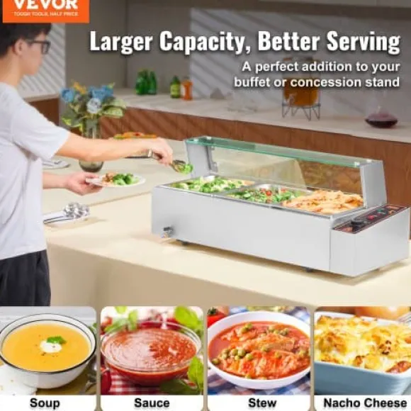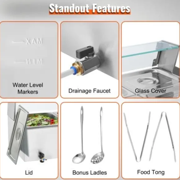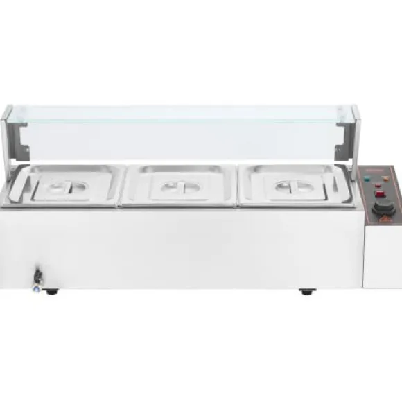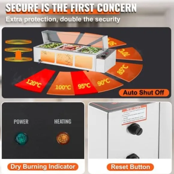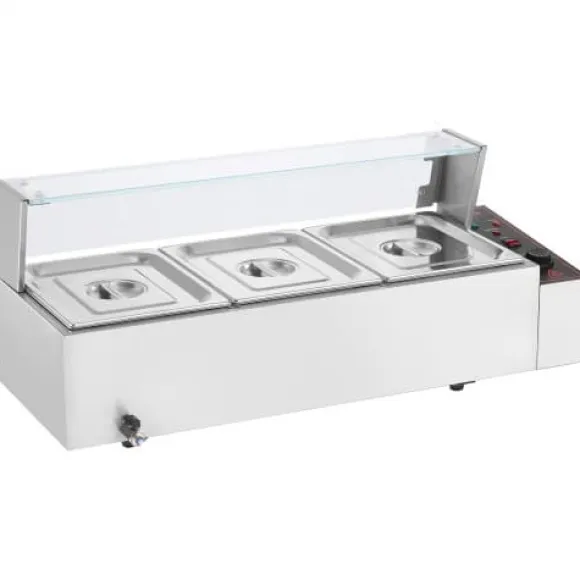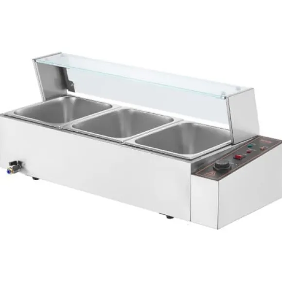 Denna kommersiella matvarmhållare är utformad för effektiv och pålitlig servering av mat, vilket gör den idealisk för catering, restauranger och bufféer. Den har snabb uppvärmning, justerbar temperaturkontroll och en hållbar konstruktion i rostfritt stål för långvarig prestanda. Enheten inkluderar tre stora behållare med lock och förbättrade säkerhetsfunktioner för bekväm och säker användning.