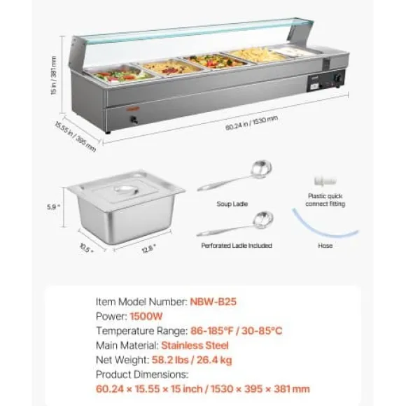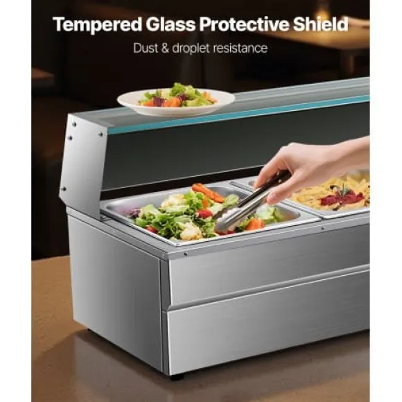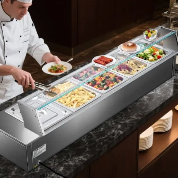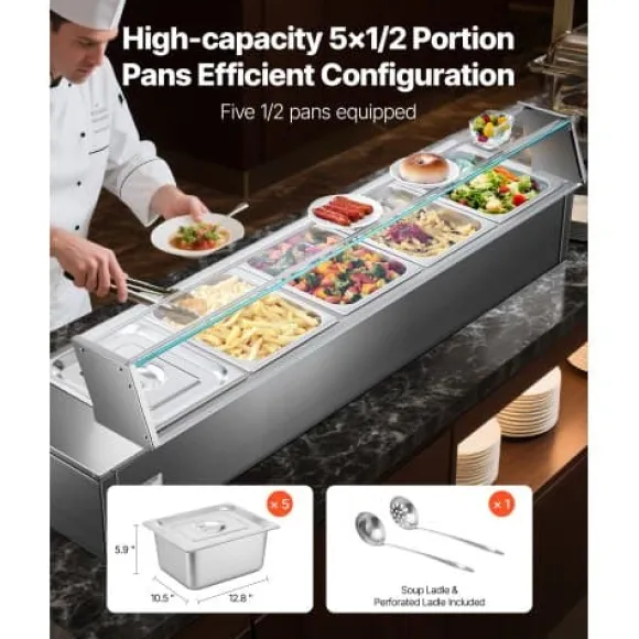 Denna kommersiella matvarmhållare är utformad för effektiv och pålitlig uppvärmning, vilket gör den idealisk för catering, bufféer, fester och restauranger. Med en robust konstruktion i rostfritt stål och ett glastäcke erbjuder den justerbar temperaturkontroll och förbättrade säkerhetsfunktioner för bekväm och säker användning. Med fem separata behållare kan du servera flera rätter samtidigt och bibehålla optimal temperatur och fräschör.