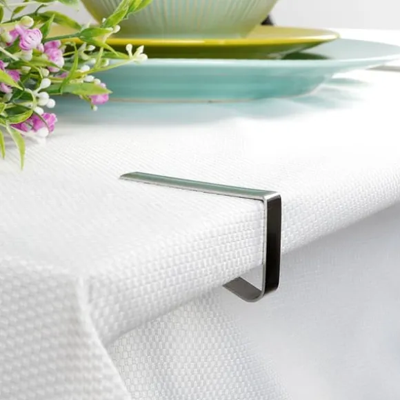 Metallklämma för bordsduk. Håller duken perfekt på bordsskivan och förhindrar att den glider. Den kommer att vara användbar i alla hem, trädgårdar, terrasser eller balkonger. Oumbärlig vid blåsigt väder under utomhusfester eller picknickar. Denna praktiska, hållbara klämma säkerställer ett stabilt grepp för duken och skyddar bordsservisen från att glida och falla. Tillverkad i enlighet med europeiska standarder.