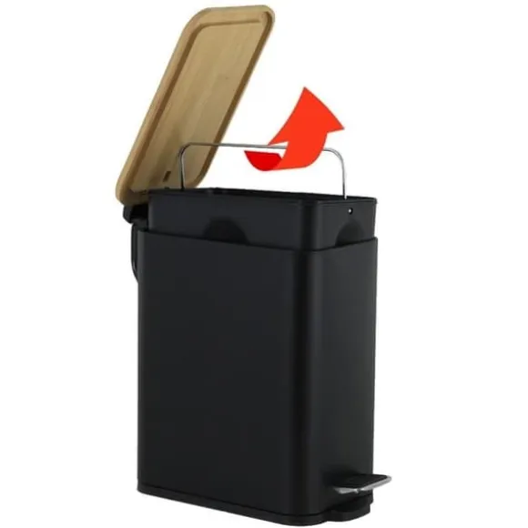 Denna papperskorg kombinerar modern design med miljövänliga material, tillverkad av pulverbelagt stål och naturligt bambuträ. Den svarta pedalpapperskorgen har en elegant matt finish, med ett lock i bambuträ som ger ett unikt, naturligt utseende. Det praktiska pedalsystemet möjliggör öppning av locket utan att använda händerna, vilket är hygieniskt och praktiskt. Den inre hinken, utrustad med ett handtag, gör tömning enkel. Den plastbasen säkerställer att ditt golv skyddas från repor. På baksidan finns ett ytterligare metallhandtag för enkel bärning eller upphängning. Med en kapacitet på 5 liter är denna papperskorg perfekt för badrum som prioriterar stil och hållbarhet.