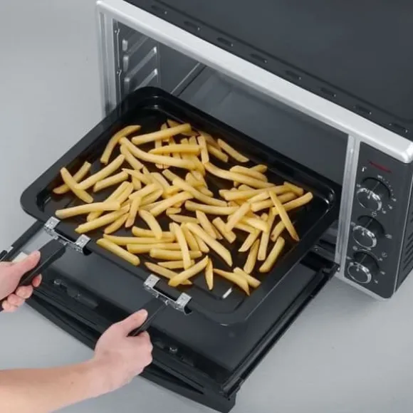SEVERIN TO2058 mini fläktugn är en 42L elektrisk ugn med en effekt på 1 800W upp till 230°C. Den är utrustad med ett grillspett och en pizzasten med en diameter på 29 cm. Topp- och bottenmotstånden är programmerbara tillsammans eller separat. Måtten på gallret och dropppannan är 38,5×31,5 cm.