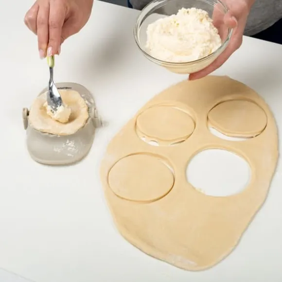 ✅ ANVÄNDBAR – Kniddelverktyg, eller en form som gör det enklare att forma dumplings. Formen producerar dumplings som är 9,5 cm breda.