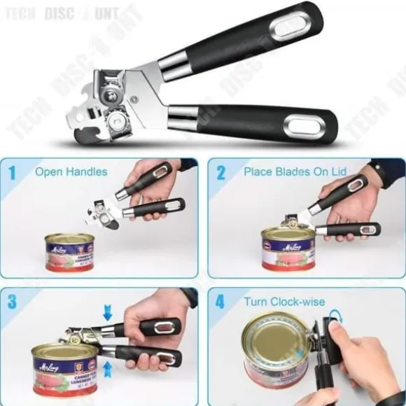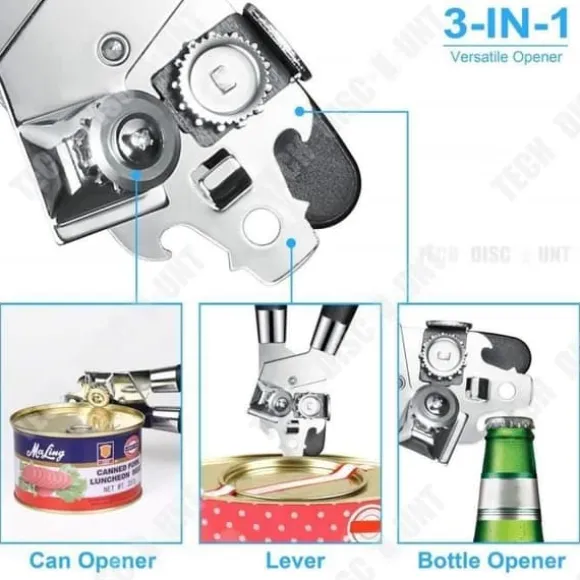 Upptäck TD® multifunktionell burköppnare, ett 3-i-1 verktyg i rostfritt stål. Den öppnar enkelt burkar och flaskor. Kompakt och lätt (190g), den är perfekt för användning hemma eller utomhus. Dimensioner: 21 x 5.6 x 4.5 cm. Ett måste för alla kockar!