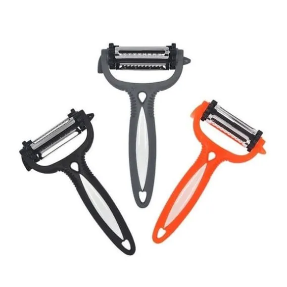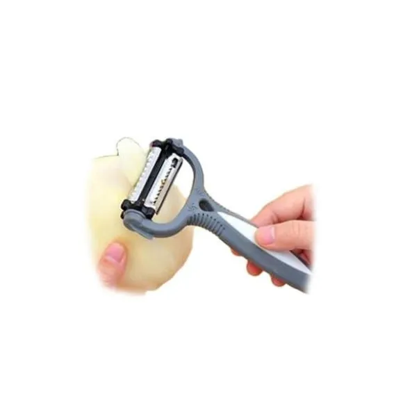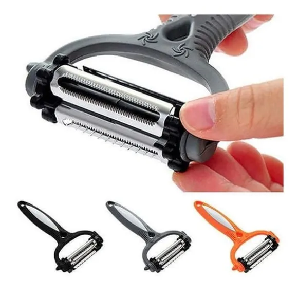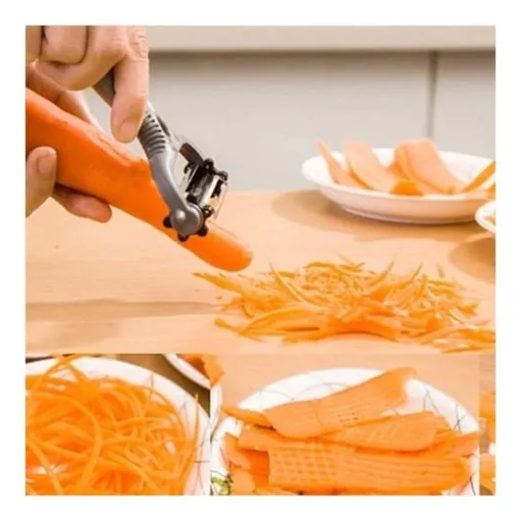 Ultra praktisk för dina sysslor i köket, denna 3-i-1 skalare kommer att hitta sin plats hos dig. Du kommer att kunna skala, riva och skära utan ansträngning. Dess vassa blad är utbytbara.* Mått: 15,3 x 7,8 x 6 cm * 3 typer av blad * Rotera blad 360 grader * Material: plast och högkvalitativ rostfritt stål * Färg: slumpmässig Funktioner: skalare, rivare, skärare