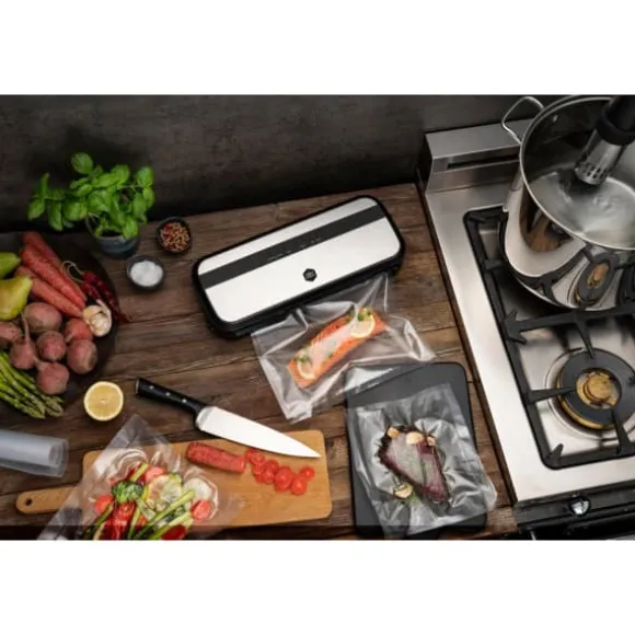 Complete Seal-vakuumförpackningsmaskin passar för vakuumförpackning av alla typer av livsmedel – inkl. kött, fisk, frukt och grönsaker. Med pulsfunktionen kan du även hantera känsliga livsmedel som bär och svamp. Den lufttäta förpackningen bevarar även aromer i torra produkter som kaffe eller te. Vakuumförpackade livsmedel kan förvaras i kylskåp eller frys. Till exempel kan vakuumförpackad och fryst nötkött hållas i 2-3 år, medan det utan vakuum endast håller i 6 månader. Färska jordgubbar möglar redan efter ett par dagar i kylskåp, men genom att vakuumförpacka dem håller de sig fräscha i kylskåpet i en vecka.