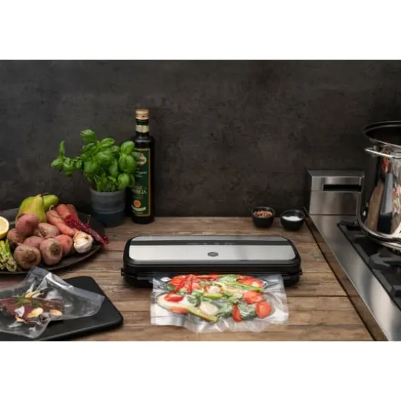 Med OBH Nordica Complete Seal-vakuumförpackningsmaskin kan du förlänga hållbarheten på livsmedel upp till fem gånger längre jämfört med vanliga förvaringsmetoder. Den är användarvänlig och passar för vakuumförpackning av alla typer av livsmedel. Syre är den största orsaken till att livsmedels näringsvärde, sammansättning, smak och kvalitet försämras. Vanliga förvaringsmetoder för livsmedel, såsom att använda plastpåsar och behållare, är därför inte optimala eftersom luft och livsmedel packas i samma utrymme. Genom att vakuumförpacka tas syret bort, vilket gör att livsmedlets smak bevaras och det håller sig färskt betydligt längre.