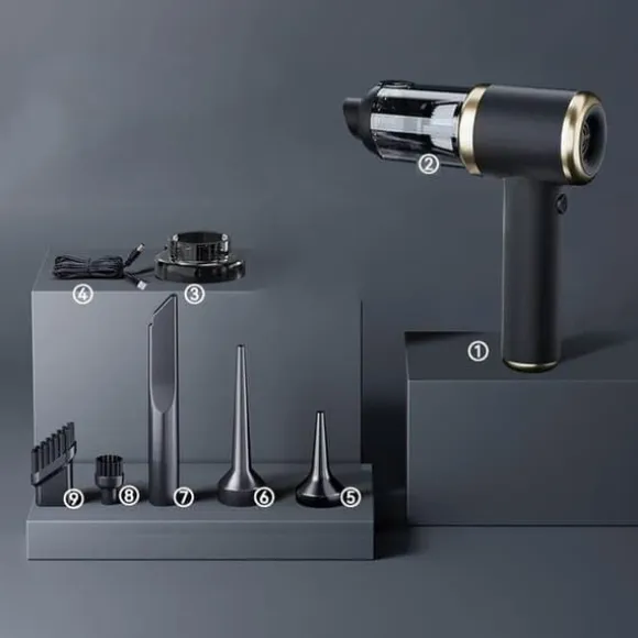 Mångsidig användning: Utrustad med flera tillbehör för både blåsfunktion och dammsugning. Perfekt för att rengöra svåråtkomliga områden som tangentbord, soffor, bilsäten och andra ytor.