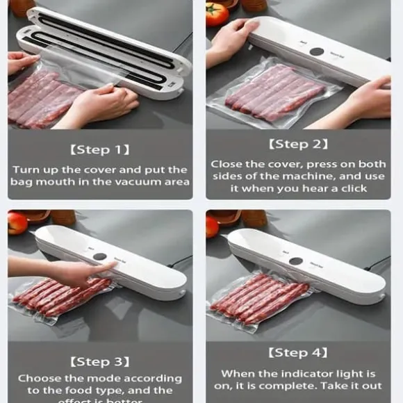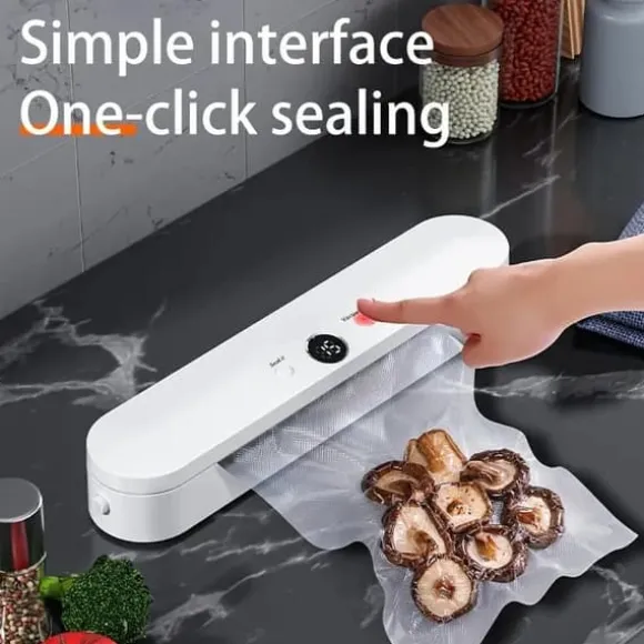 Denna vacuum sealer maskin bevarar maten längre genom att effektivt ta bort luft från förslutningspåsarna. Perfekt för både torr och fuktig mat – från kött, fisk och grönsaker till snacks och bakverk.