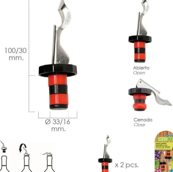 Lufttät lock för vin eller öl med tätningssystem. Genom att manövrera spaken sprids silikonet in i flaskans hals och förhindrar att luft kommer in och ut. Denna propp behåller vinets egenskaper längre och passar även till kolsyrat vatten, öl, läsk m.m. Tillverkad av rostfritt stål med en silikonkropp, säljs den i en uppsättning av två enheter i en blisterförpackning med en skyddande plastkapsel.