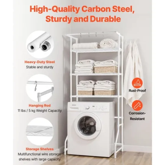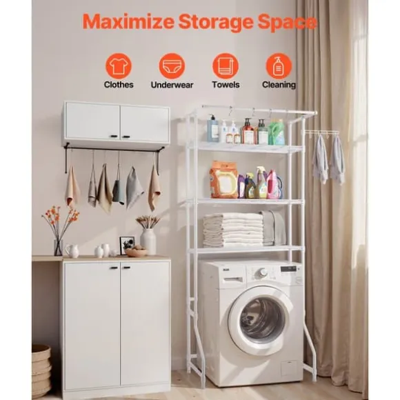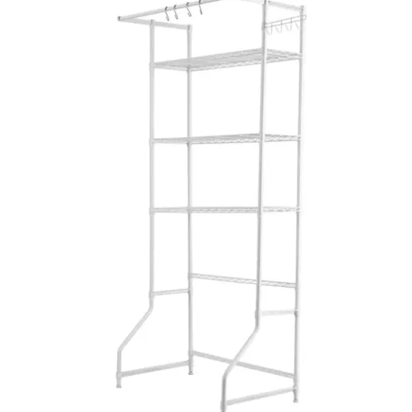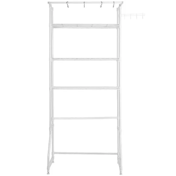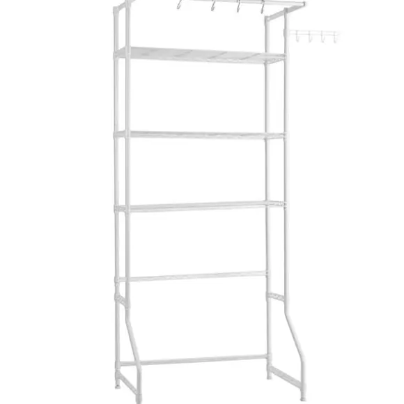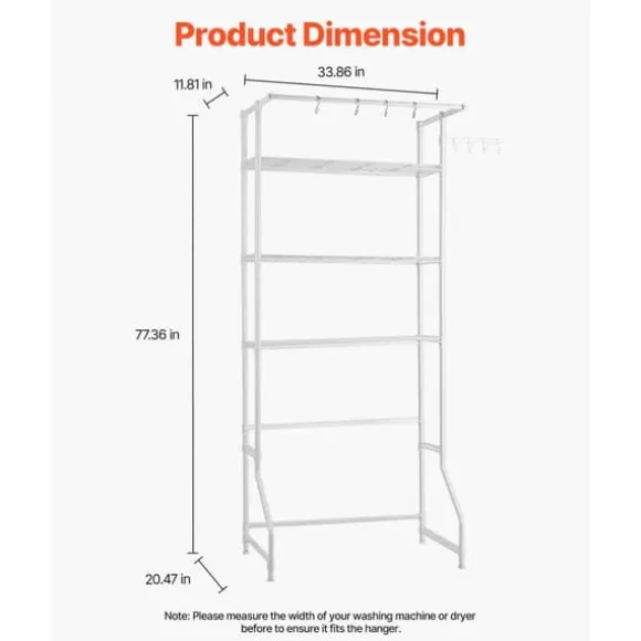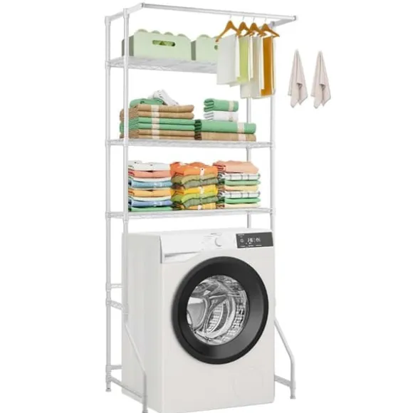 Denna förvaringshylla för tvättmaskin och torktumlare är utrustad med metallförvaringshyllor, hängstänger och krokar, vilket ger ett enkelt sätt att hänga lättviktskläder, handdukar eller rengöringsmedel. Dess kompakta design passar de flesta tvättmaskiner och torktumlare med en bredd på upp till 30,5 tum, vilket gör den idealisk för små och stora tvättstugor.