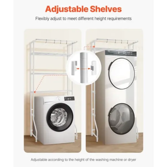 Med justerbara hyllhöjder gör denna förvaringshylla för tvättmaskin det möjligt att ordna förvaringsutrymme efter dina behov. Dessutom garanterar dess justerbara nivelleringsfötter stabilhet på ojämna golv, vilket håller ställningen stadig i alla miljöer.