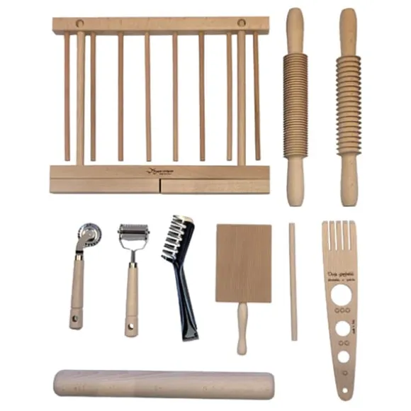 Innehåller: 1 st pasta tork, 1 st gnocchi bräda, 1 st böjt raviolihjul, 1 st 4 x 4 raviolihjulskärare, 1 st pastatång, 1 st pastamått/slev, 1st spagetti kavel, 1st fettuccine kavel samt 1 st rak kavel