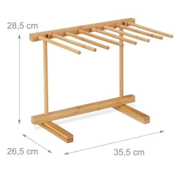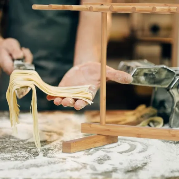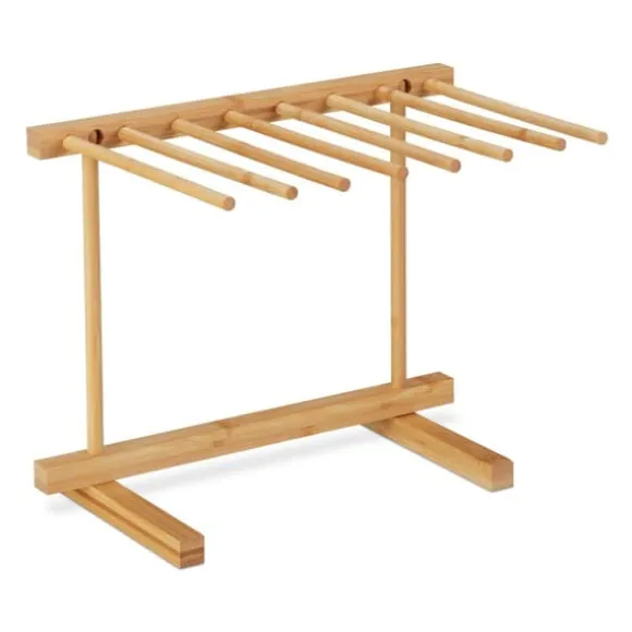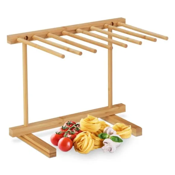 Torka din hemlagade pasta enkelt och effektivt med detta praktiska pastaställ, utformat för att säkerställa optimal luftcirkulation för snabb och jämn torkning. Dess vikbara design gör det perfekt för små kök, så att du kan spara plats när det inte används. Tillverkat av naturlig bambu, erbjuder detta ställ en stabil och säker plats för dina pastaskapelser.