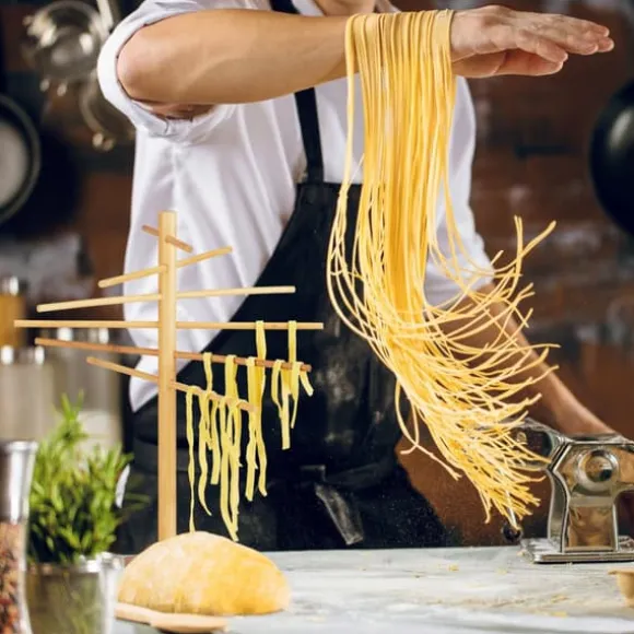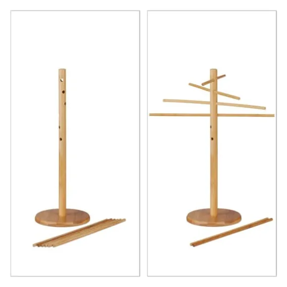 Detta pastaställ i bambu erbjuder en praktisk och naturlig lösning för att torka hemmagjord pasta och köksörter. Den är enkel att montera, har avtagbara armar och en kompakt design som gör den smidig för alla kök, medan de förskjutna armarna säkerställer att pastan inte klibbar ihop. Den stadiga basen ger stabilitet under användning.
