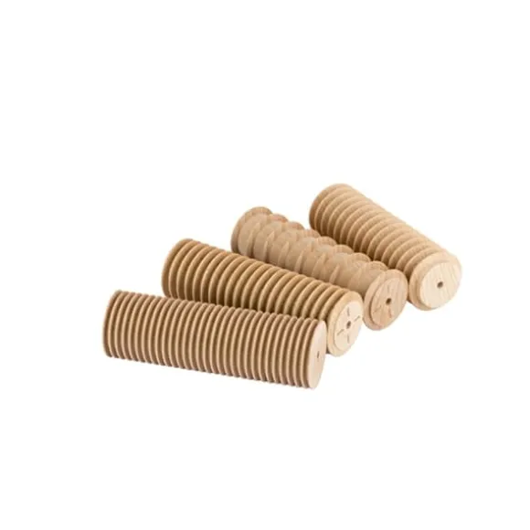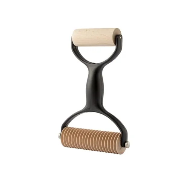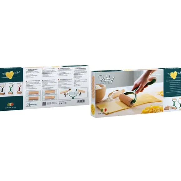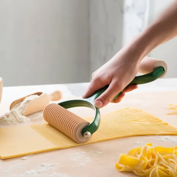 Denna pastaskärare och kavel har fyra utbytbara valsar. Inkluderar en fast vals för att sträcka ut och rulla ut pastan. Alla valsar är tillverkade av bokträ. Rullstorlekar inkluderar: tagliolini, tagliatelle, fettuccine, papperadelle.