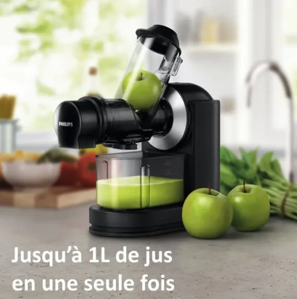 150W – Långsam rotation – XL skorsten: 70 mm – Snabbrengöring på 90 sekunder – Diskmaskinkompatibel – Sladdlagring – PÅ / AV-knapp – Ingår: Kanna + Receptbok – Garanti: 2 år