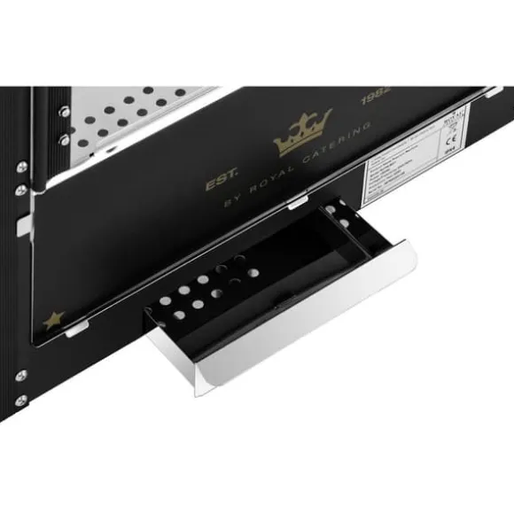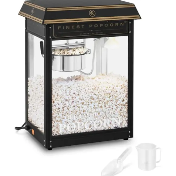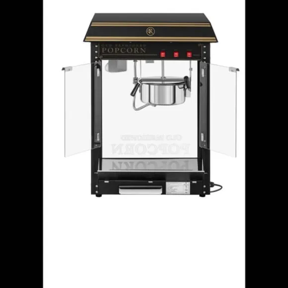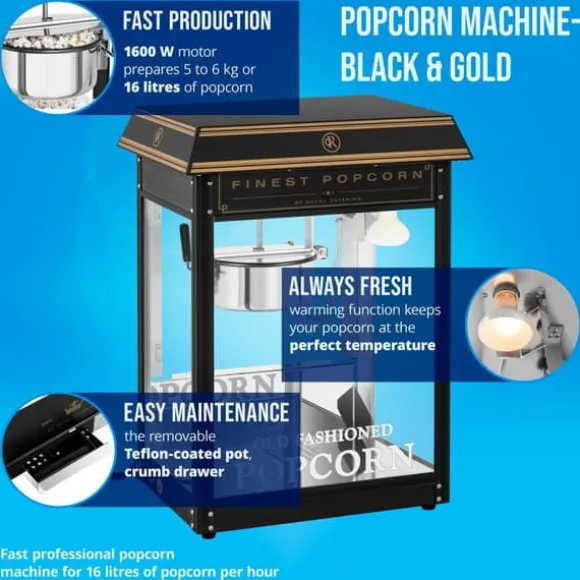 Popcornmaskinen RCPS-BG1 från Royal Catering är speciellt designad för professionella cateringbehov och är ett absolut blickfång. Den imponerar inte bara med sitt tilltalande hölje i svart och guld, utan också med en uppvärmd och upplyst kammare, ett omrörningssystem och en automatisk termostat. Låt dig övertygas av popcornmaskinen RCPS-BG1 och ge dina kunder en extraordinär popcornupplevelse – på bio, på mässor eller festivaler!