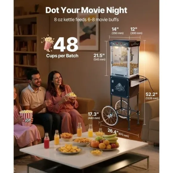 Den retro popcornmaskinen med en kapacitet på 225 g är perfekt för att göra upp till 48 koppar popcorn per omgång, vilket räcker för 6–8 personer. En perfekt underhållning för sportevenemang och fester.