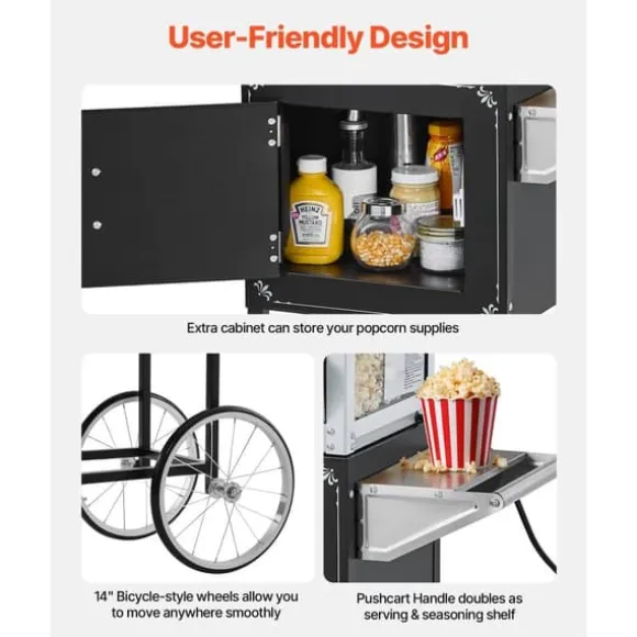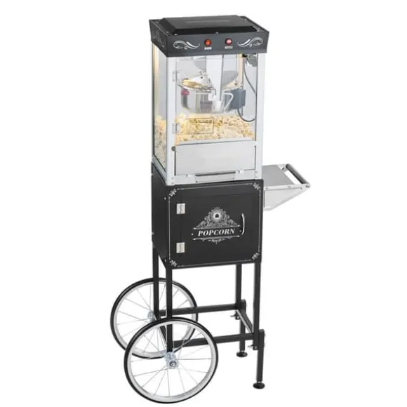 Med denna popcornmaskin i teaterstil kan du justera sötman och kryddningen för att passa dina smaker. Den effektiva vattenkokaren värms upp på några minuter och håller popcornen varma och krispiga tills de serveras. Enkel att använda med kontrollbrytare för ljus, värme, värmeelement och omrörare. Stålkroppen och härdat glas garanterar hållbarhet för frekvent användning. Hjulen gör det enkelt att flytta runt och skåpet erbjuder lagringsutrymme för popcorntillbehör.