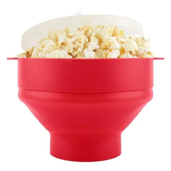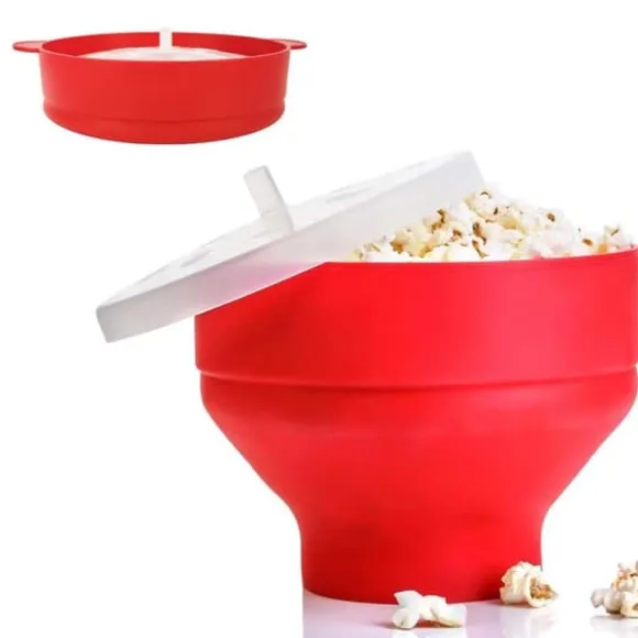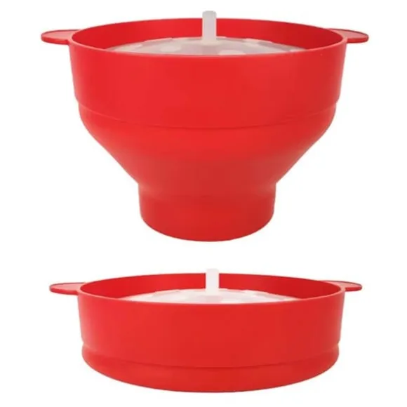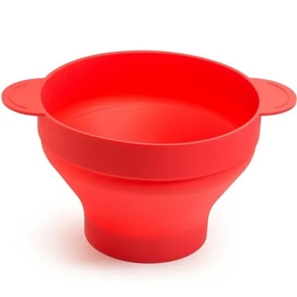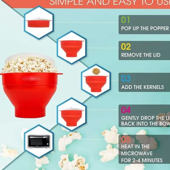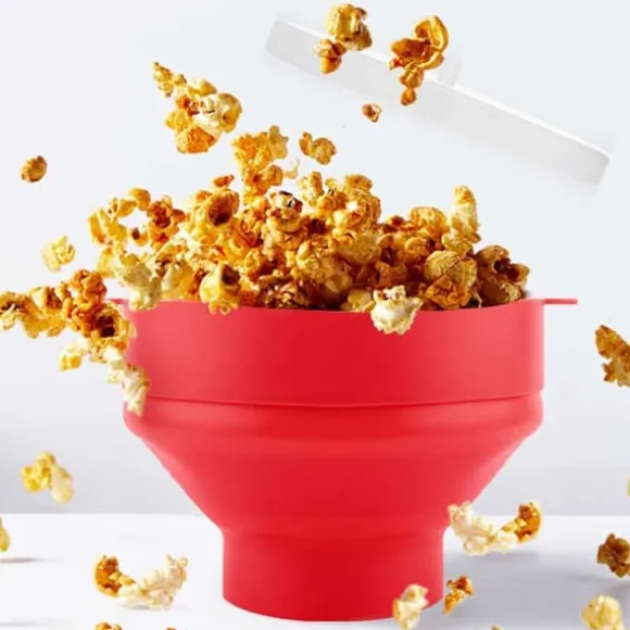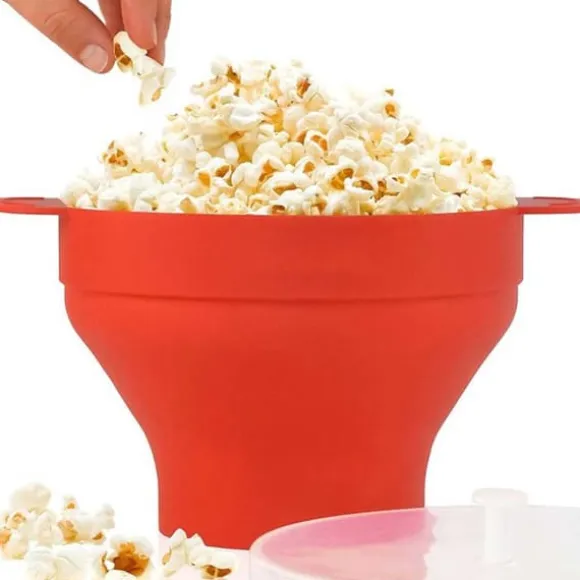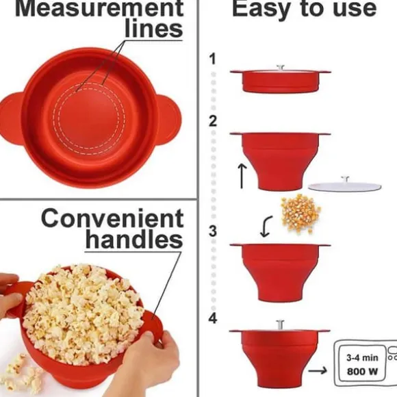 Slipp krånglet med att göra popcorn i kastrull och få nyttigare popcorn än tråkiga mikropåsar. Inget extra fett behövs men kan användas efter smak. Skålens hopvikbara design gör den enkel att förvara efter användning.