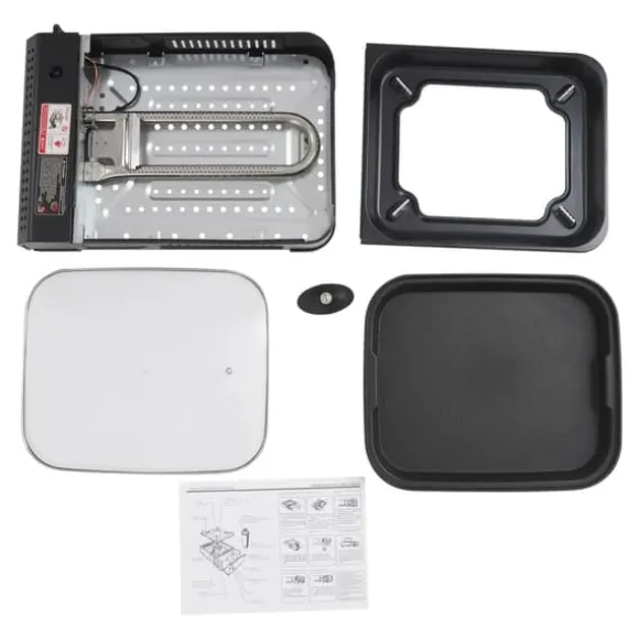 Mångsidigt bordsstativ med gas och grillpannaEn modern rektangulär bordsbrännare för snabb matlagning hemma eller på språng. Med 2,1 kW effekt, piezotändning och steglös lågreglering ger den jämn värme för stekning och grillning. Robust konstruktion i rostfritt stål, stål, plast och härdat glas för lång hållbarhet.