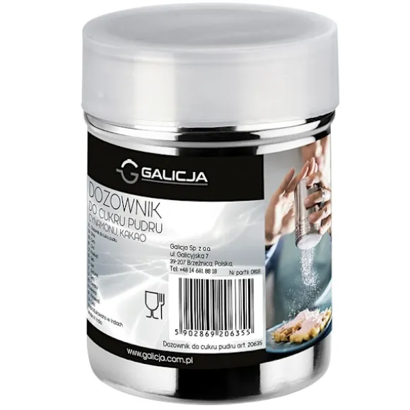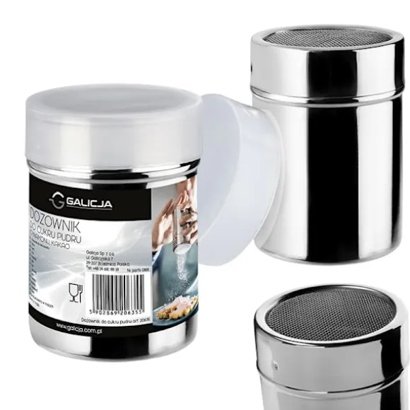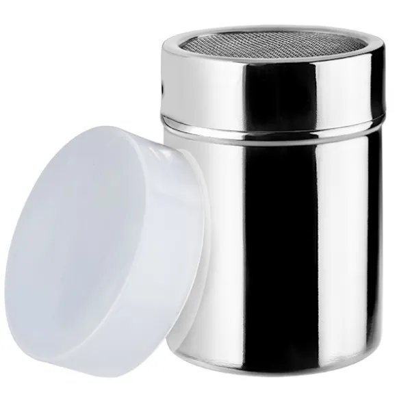 Behållaren med sil används för att sikta florsocker, kakao, kanel och andra lösa produkter direkt på den serverade tallriken, desserten eller till och med kaffet